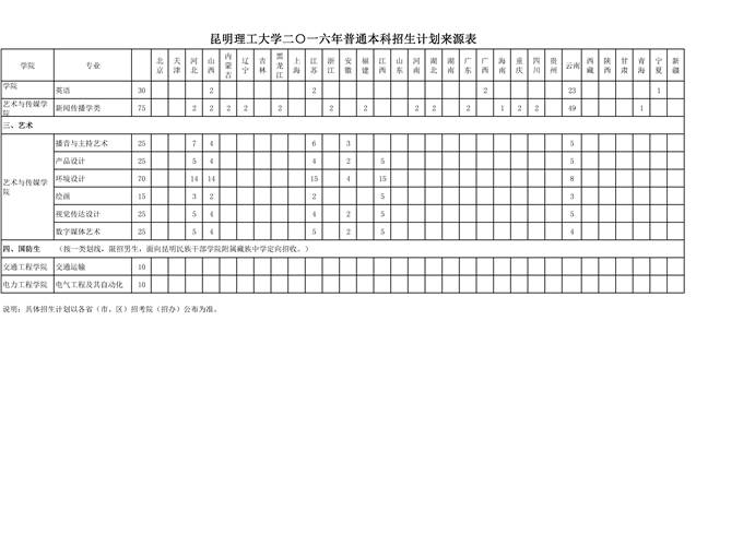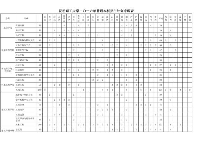 昆明理工大學(xué)2016年高等職業(yè)教育普通本科招生計(jì)劃來(lái)源表