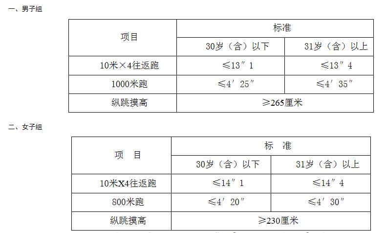 體能素質(zhì)測(cè)試成績(jī)合格者,方可進(jìn)入面試,體能測(cè)試的合格標(biāo)準(zhǔn)附后。