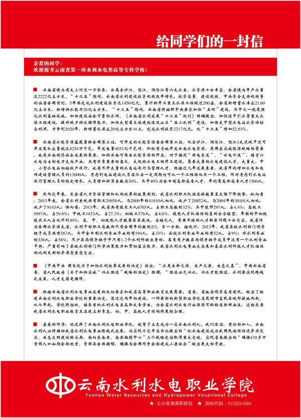 親愛的同學(xué):你選擇了云南水利水電職業(yè)學(xué)院,就等于立志成為一名云南水利人。我們深信,有你的加入,云南水利人必將推動(dòng)我省水利水電事業(yè)跨越式發(fā)展,為實(shí)現(xiàn)習(xí)近平總書記提出的“把云南建設(shè)成為我國民族團(tuán)結(jié)進(jìn)步示范區(qū)、生態(tài)文明建設(shè)排頭兵、面向東南亞、南亞輻射中心”三個(gè)戰(zhàn)略定位取得重大突破,實(shí)現(xiàn)省委提出的“確保470多萬貧困人口如期全部脫貧、貧困縣全部摘帽,確保與全國同步全面建成小康社會(huì)”做出更大的貢獻(xiàn)。