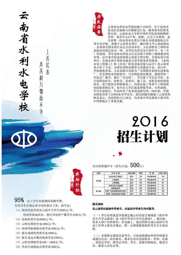 第二條學(xué)校名稱:云南水利水電職業(yè)學(xué)院。地址:昆明市富民縣永定街道辦事處。上級主管部門:云南省水利廳。辦學(xué)層次及類型:高職??疲k,全日制。學(xué)制:三年。招生范圍及對象:云南省內(nèi)應(yīng)屆高中理科畢業(yè)生。