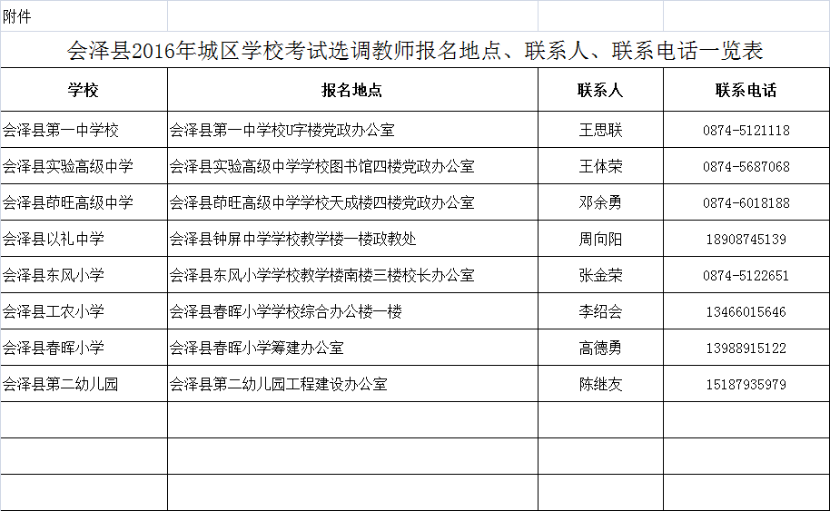 2.報(bào)名地點(diǎn)。報(bào)考學(xué)校管理崗位的在會(huì)澤縣教育局組織人事科,其余報(bào)考崗位在相應(yīng)報(bào)考學(xué)校進(jìn)行(具體地點(diǎn)、聯(lián)系人、聯(lián)系電話見附表)。