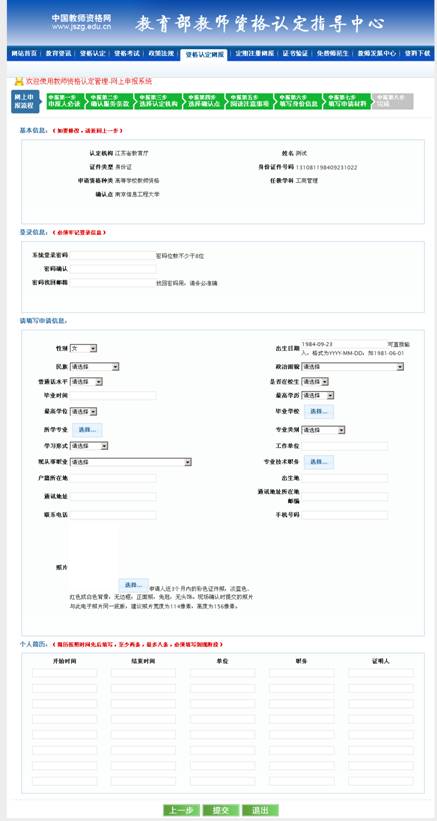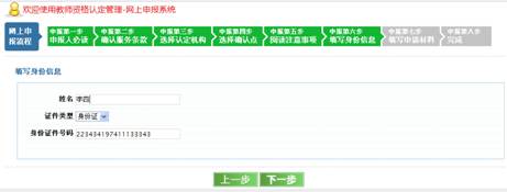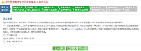 認真閱讀“申請人必讀”內(nèi)容,尤其注意您應該選擇的教育行政部門(即認定機構)。閱讀完必讀內(nèi)容后,點擊“下一步”按鈕,進入申報第二步。