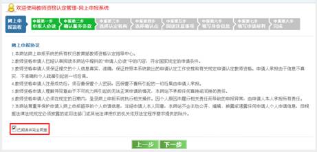申請人閱讀“網(wǎng)上申報協(xié)議”完畢,只有先選中“已閱讀并完全同意”前的復選框,才可點擊“下一步”按鈕,進入申報第三步,否則系統(tǒng)將給出提示。
