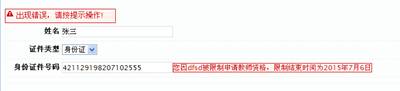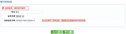 未參加全國統(tǒng)考申請人網(wǎng)上報名時填寫完“個人身份信息”后不能進(jìn)行下一步的操作,并出現(xiàn)錯誤提示,怎么辦?