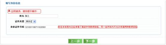 4、出現(xiàn)“您已喪失教師資格,不能再申請教師資格”或“您因×××被限制申請教師資格,限制結(jié)束時間為×××”的提示怎么辦?