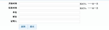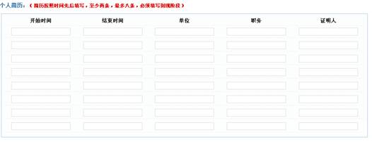 首次在網(wǎng)上申報(bào)填寫注冊(cè)信息時(shí),可直接在表格中按時(shí)間先后順序依次輸入每條簡(jiǎn)歷,不得少于兩條,最多輸入八條。每一條簡(jiǎn)歷的開始時(shí)間、結(jié)束時(shí)間、單位、職務(wù)和證明人都不能為空。如下圖所示: