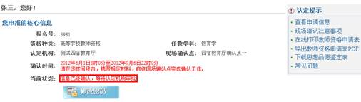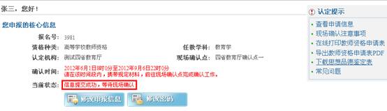 2、如果申請人在現(xiàn)場確認(rèn)時間截止之前已經(jīng)進(jìn)行了現(xiàn)場確認(rèn),即登錄報名系統(tǒng)后您申報的核心信息中的當(dāng)前狀態(tài)為“信息已經(jīng)確認(rèn),等待認(rèn)定機(jī)構(gòu)審批”,則申請人無法自行修改申報信息。如下圖: