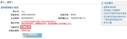 3、如果申請人進(jìn)行現(xiàn)場確認(rèn)時因某些條件不具備而沒有通過確認(rèn),即登錄報名系統(tǒng)您申報的核心信息中的當(dāng)前狀態(tài)為“確認(rèn)未通過”,則申請人無法自行修改申報信息。如下圖: