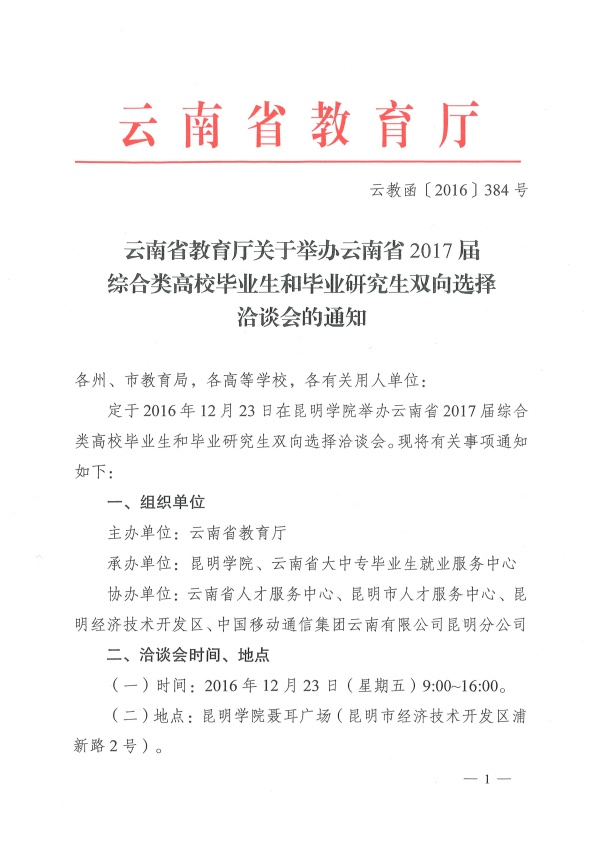 昆明學(xué)院2017屆綜合類畢業(yè)生雙向選擇洽談會通知