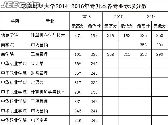 云南財(cái)經(jīng)大學(xué)2014-2016年專升本各專業(yè)錄取分?jǐn)?shù)