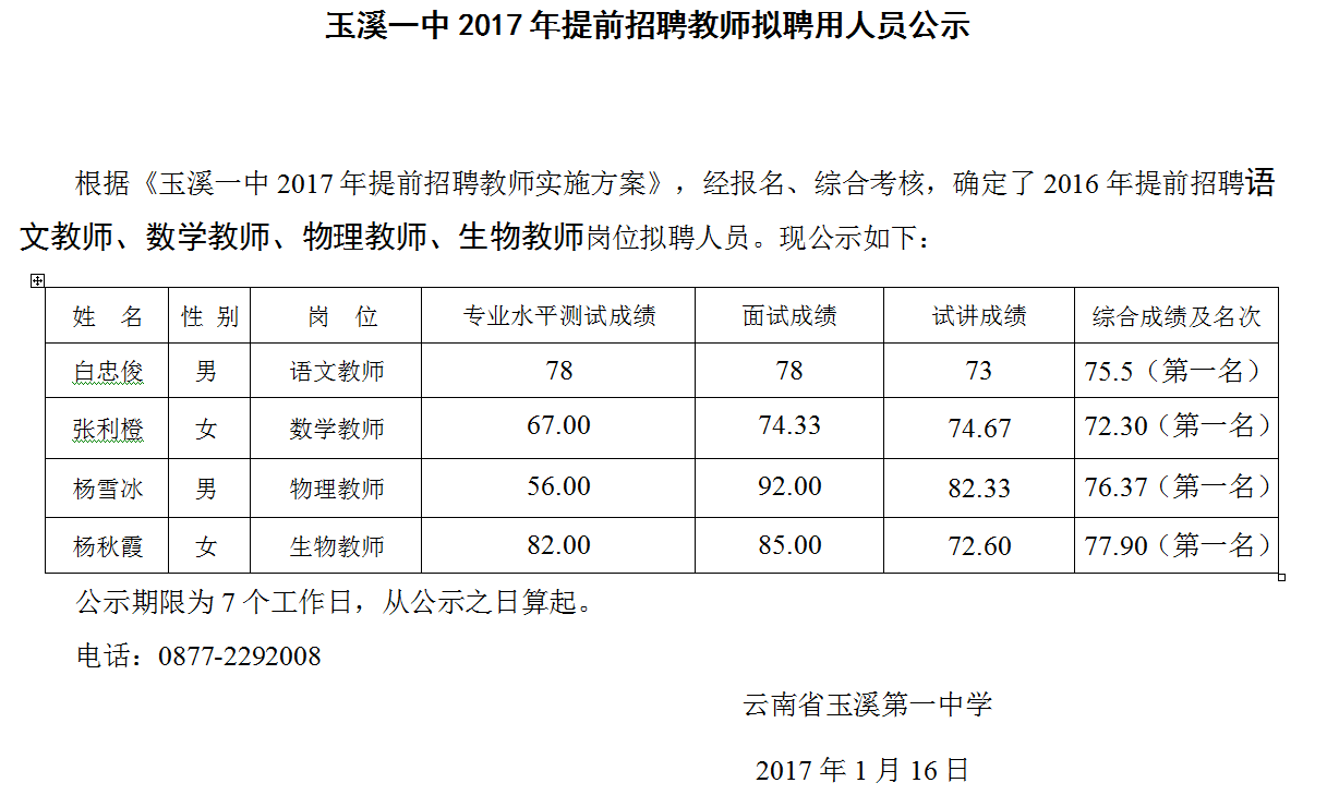 玉溪一中2017年提前招聘教師擬聘用人員公示