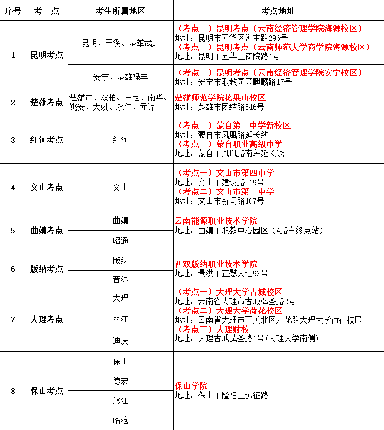 云南省2017年單招考試考點(diǎn)設(shè)置情況表