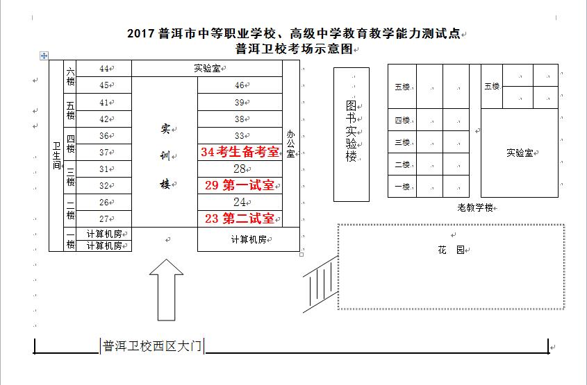 申請認定中等職業(yè)學校教師資格人員在普洱衛(wèi)校西區(qū)實訓樓二樓2—23教室進行測試;申請認定高級中學教師資格人員在普洱衛(wèi)校西區(qū)實訓樓三樓3—29教室進行測試,西區(qū)實訓樓四樓4—34為考生備課室。