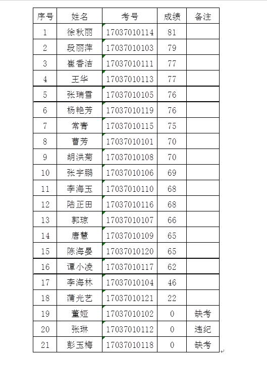 二〇一七年公開(kāi)選調(diào)教師筆試成績(jī)公示