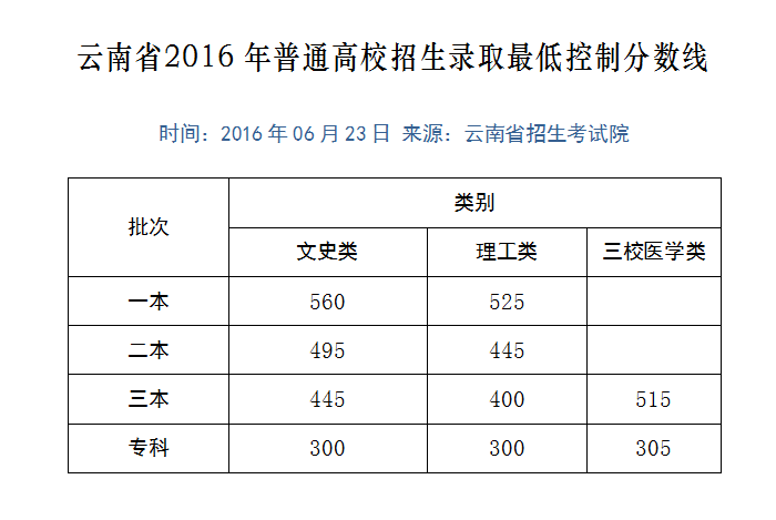 云南省2017年普通高校招生錄取最低控制分?jǐn)?shù)線