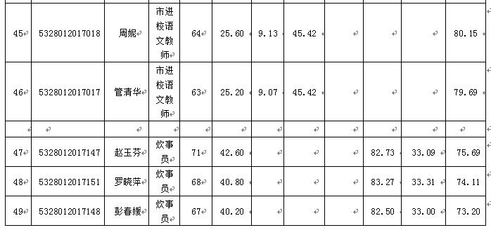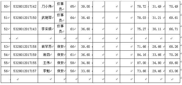 根據(jù)《景洪市教育局2017年城區(qū)中小學(xué)、幼兒園公開選調(diào)教師及工勤崗位人員實(shí)施方案》,景洪市教育局通過(guò)組織筆試、面試,現(xiàn)將綜合成績(jī)公示如下: