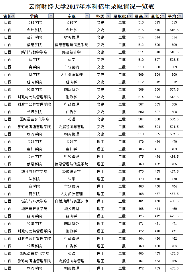 云南財經(jīng)大學(xué)2017年山西省錄取情況一覽表