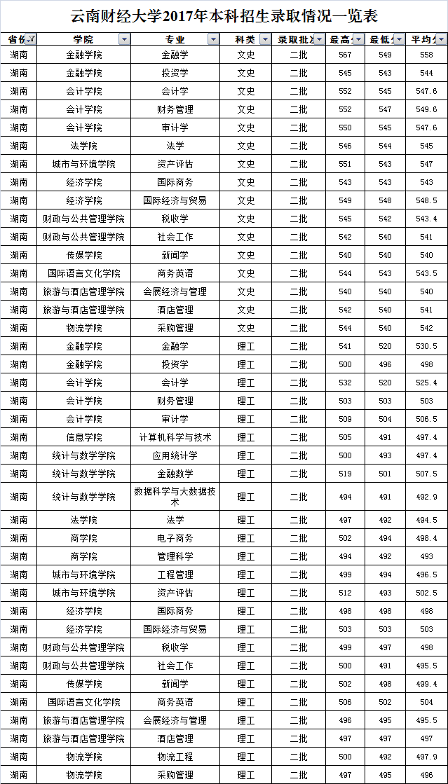 云南財(cái)經(jīng)大學(xué)2017年湖南省錄取情況一覽表
