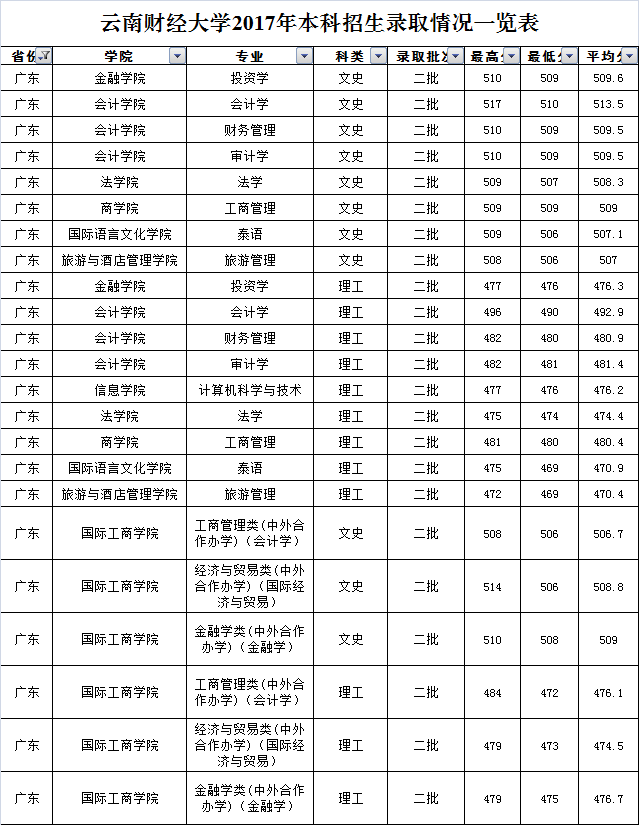 云南財經(jīng)大學2017年廣東省錄取情況一覽表