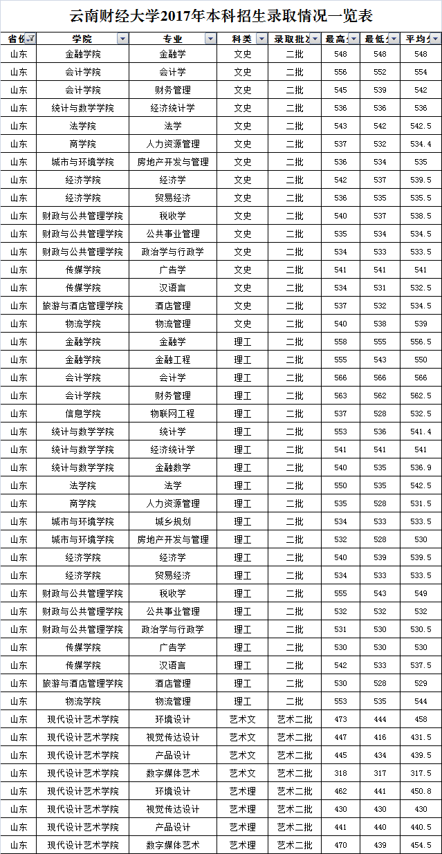 云南財經(jīng)大學2017年山東省錄取情況一覽表