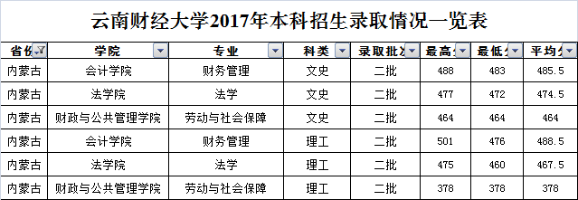 云南財經(jīng)大學2017年內(nèi)蒙古自治區(qū)錄取情況一覽表