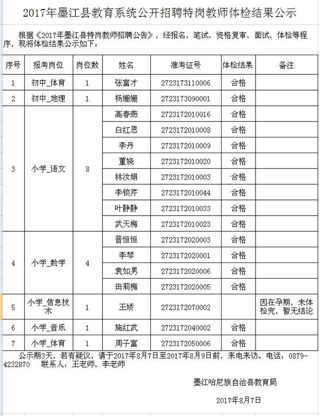 2017年墨江縣公開(kāi)招聘特崗教師體檢結(jié)果公示