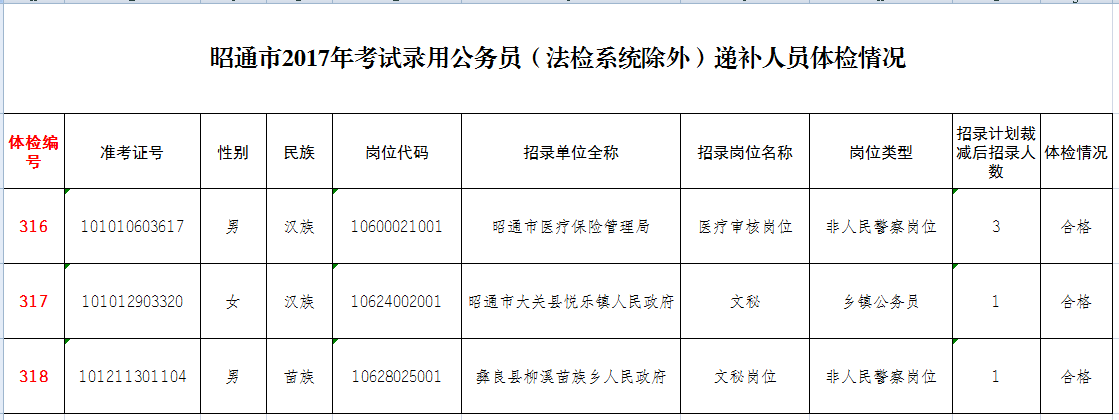 昭通市2017年考試錄用公務(wù)員(非法檢)遞補人員體檢情況