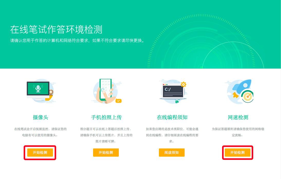 1.本次筆試全程視頻監(jiān)控,請確保您的電腦安裝了Chrome瀏覽器(44以上版本,下載網(wǎng)址https://www.baidu.com/s?wd=chrome)和攝像頭,并盡快前往https://assistant.ceping.com進行攝像頭、網(wǎng)絡(luò)等作答環(huán)境的檢測;