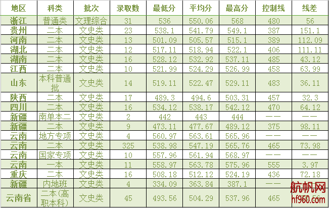 西南林業(yè)大學(xué)2017年全國各省份文史類錄取情況表