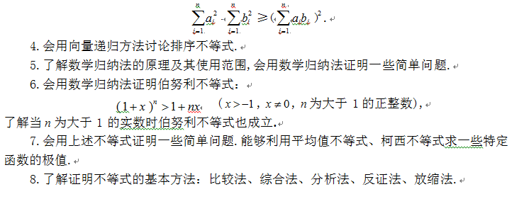 3.推理論證能力:推理是思維的基本形式之一,它由前提和結(jié)論兩部分組成;論證是由 已有的正確的前提到被論證的結(jié)論的一連串的推理過(guò)程.推理既包括演繹推理,也包括合情 推理;論證方法既包括按形式劃分的演繹法和歸納法,也包括按思考方法劃分的直接證法和 間接證法.一般運(yùn)用合情推理進(jìn)行猜想,再運(yùn)用演繹推理進(jìn)行證明.