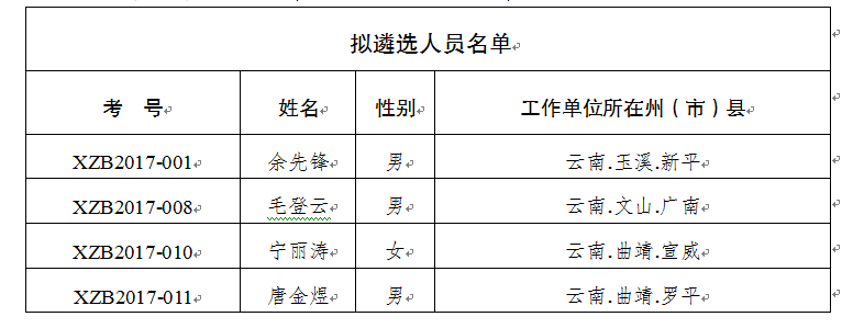 根據(jù)《中共宣威市委辦公室宣威市人民政府辦公室關(guān)于印發(fā)宣威市市直機(jī)關(guān)公開(kāi)遴選公務(wù)員實(shí)施辦法(試行)的通知》(宣辦發(fā)〔2017〕114號(hào))規(guī)定,宣威市人民政府辦公室2017年公開(kāi)遴選公務(wù)員工作嚴(yán)格按照?qǐng)?bào)名、資格復(fù)審、筆試、面試、經(jīng)歷業(yè)績(jī)?cè)u(píng)價(jià)、體檢、考察等程序,已確定擬遴選人員,現(xiàn)公示如下: