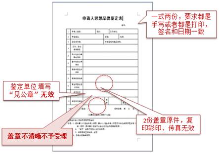有工作單位的,《申請人思想品德鑒定表》除加蓋工作單位公章外,表中第7、8、9項還需加蓋本人人事檔案存放地有存檔權(quán)的人事檔案存放部門的公章;