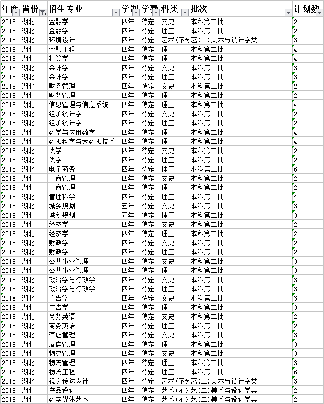 云南財經(jīng)大學2018年本科分省招生計劃表(湖北)
