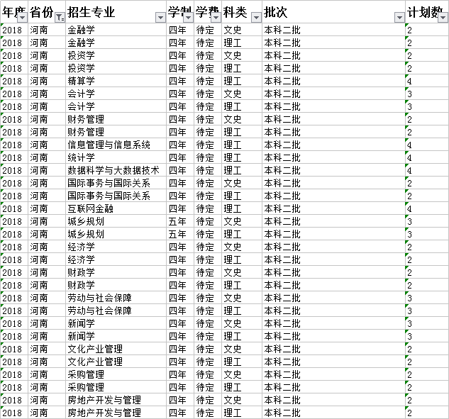 云南財經(jīng)大學(xué)2018年本科分省招生計劃表(河南)