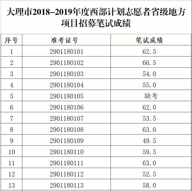 大理市2018—2019年度大學(xué)生志愿服務(wù)西部計(jì)劃省級(jí)地方項(xiàng)目志愿者招募筆試環(huán)節(jié)已結(jié)束。本次招募自7月24日發(fā)布公告以來,共72人報(bào)名,全部資格審查合格。8月4日上午9:00-11:00在下關(guān)四小舉行筆試,應(yīng)考72人,實(shí)考65人,缺考7人。根據(jù)《大理州2018-2019年度西部計(jì)劃志愿者省級(jí)地方項(xiàng)目招募工作實(shí)施方案》的規(guī)定,現(xiàn)將考生筆試成績(jī)公布如下: