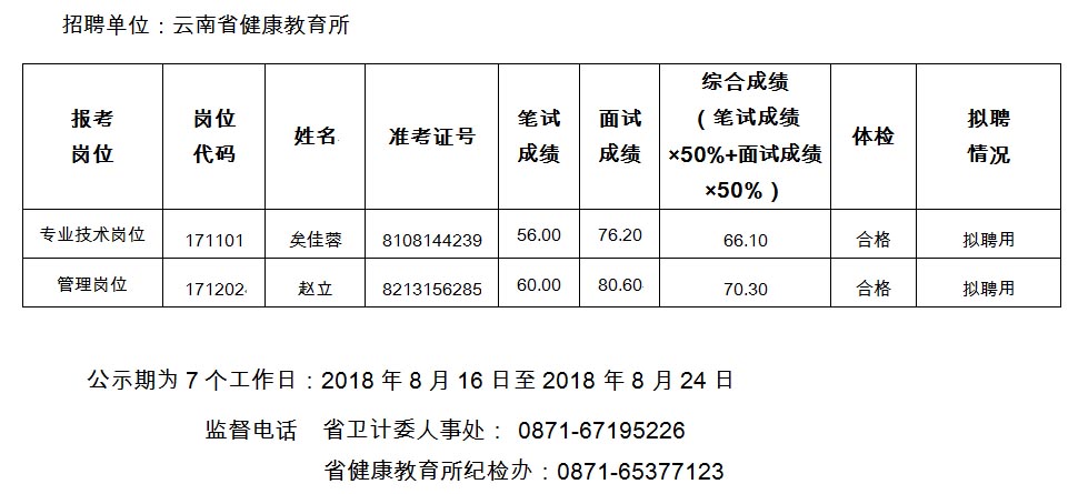 云南省健康教育所2018年公開招聘工作人員擬聘人員公示