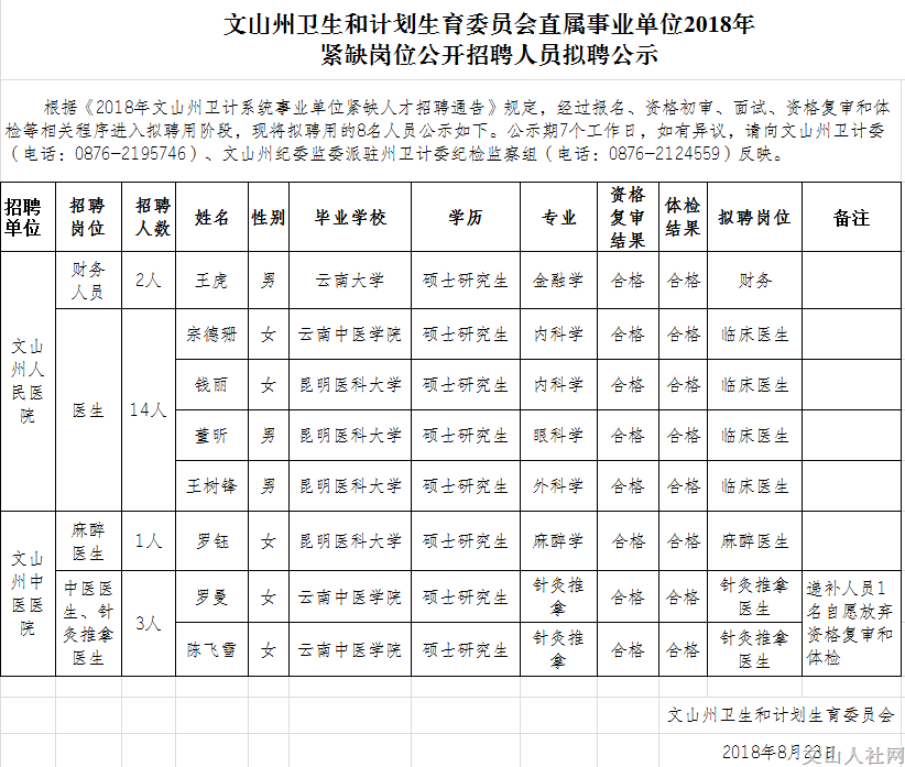 文山州衛(wèi)計(jì)委直屬事業(yè)單位2018年緊缺崗位公開(kāi)招聘人員擬聘公示