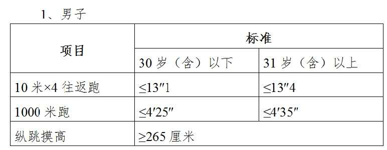 體能測評參照公安部《關于印發(fā)公安機關錄用人民警察體能測評項目和標準(暫行)的通知》及其所附標準進行。體能測試的項目如下: