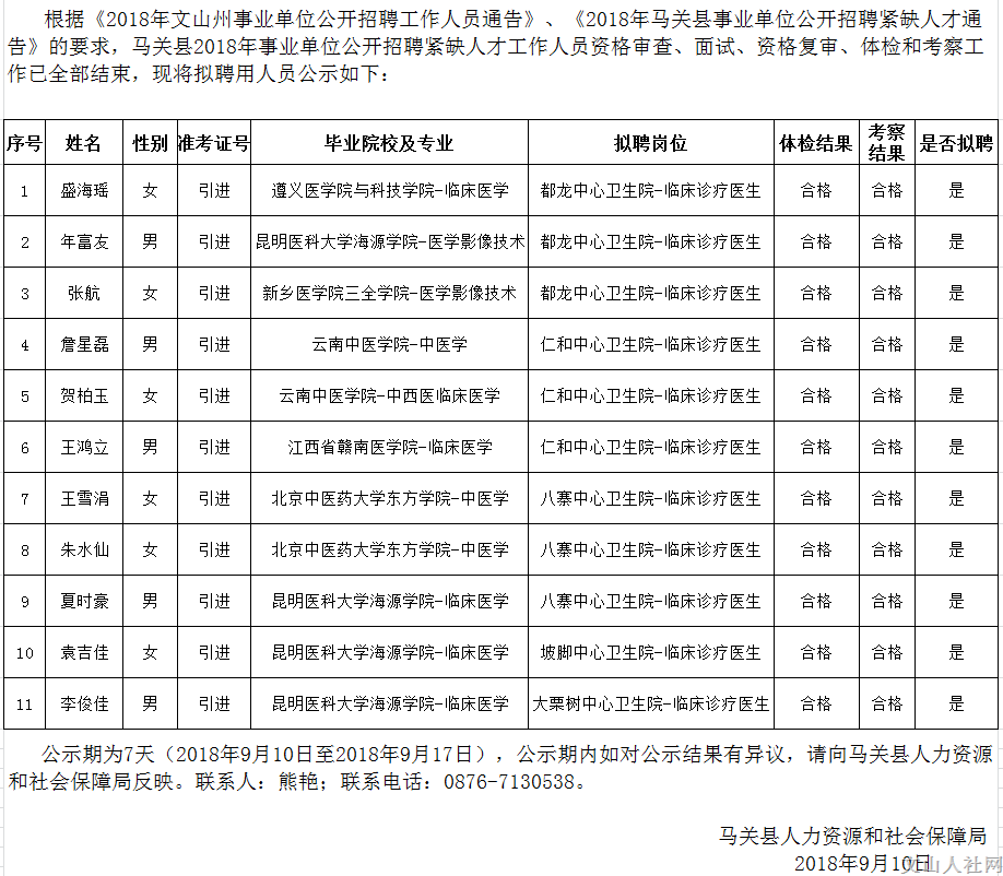 馬關(guān)縣2018年事業(yè)單位緊缺招聘工作人員擬聘用人員名單