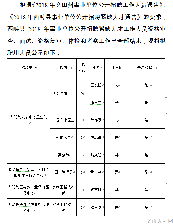 2018年文山州西疇縣事業(yè)單位招聘緊缺人才擬聘人員公示
