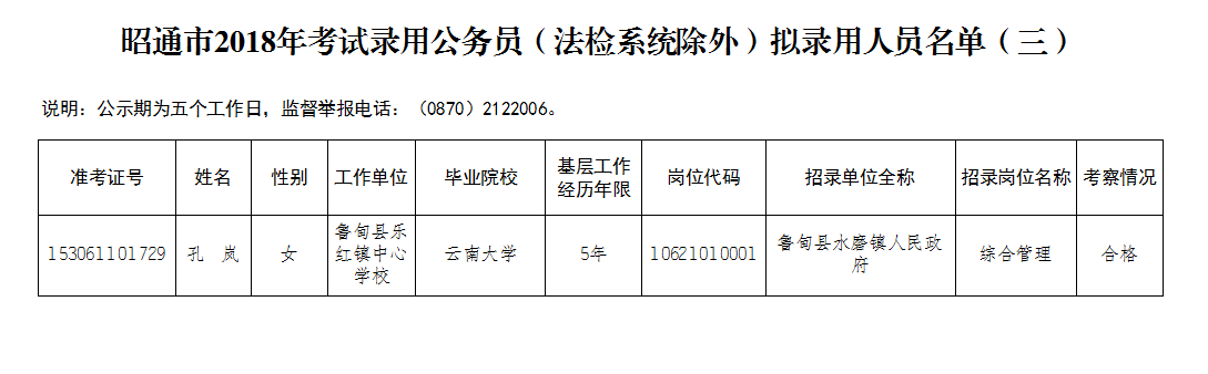 昭通市2018年考試錄用公務員(非法檢)擬錄名單(三)