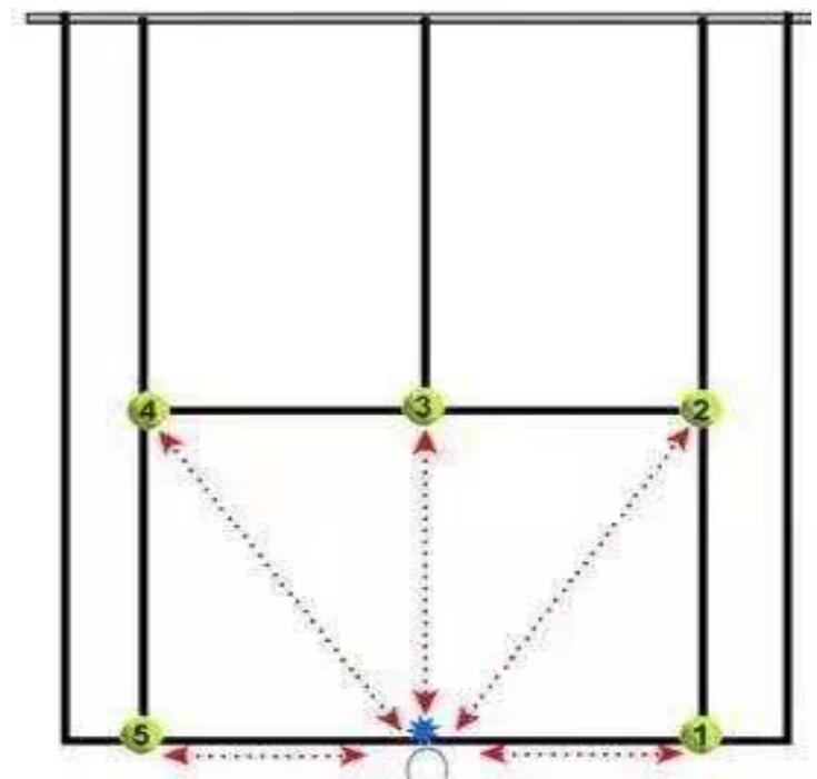 (三)扇形跑(20 分) 1.測試方法:將一支球拍放在底線中點(diǎn)后面,拍頭指向球網(wǎng),5 個球 的位置如圖所示。沿著逆時針方向依次取回 5 個球,將每次取回的球 放在球拍拍面上。測試員喊‘預(yù)備-開始’之后,秒表計時開始,記 錄完成時間。