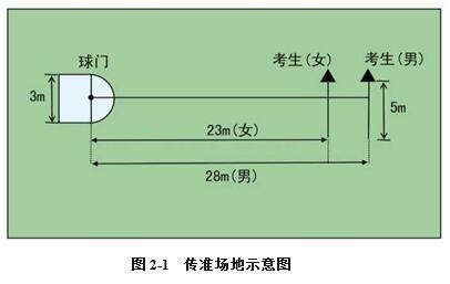 (一)考試方法:如圖 2-1 所示,傳球目標區(qū)域由一個室內(nèi)五人制 足球門(球門凈寬度 3 米,凈高度 2 米)和以球門線為直徑(3 米)畫的半圓組成,圓心(球門線中心點)至起點線垂直距離為男 子 28 米,女子 23 米??忌殞⑶蛑糜谄瘘c線上或線后(線長 5 米,寬 0.1 米),向目標區(qū)域連續(xù)傳球 6 次,左右腳均可,腳法不 限。
