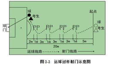 (一)考試方法:如圖 2-2 所示,從罰球區(qū)線中點垂直向場內(nèi)延伸 至 20 米處,畫一條平行于球門線的橫線作為起點線。距罰球區(qū)線 2 米處起,沿 20 米垂線共插置 8 根標志桿??忌鷮⑶蛑糜谄瘘c線上, 運球依次繞過 8 根標志桿后起腳射門,球動開表計時,當球從空中 或地面越過球門線時停表,記錄完成的時間。凡出現(xiàn)漏桿、射門偏 出球門,球擊中橫梁或立柱彈出,均屬無效,不計成績。每人測試 2 次,取最好成績。