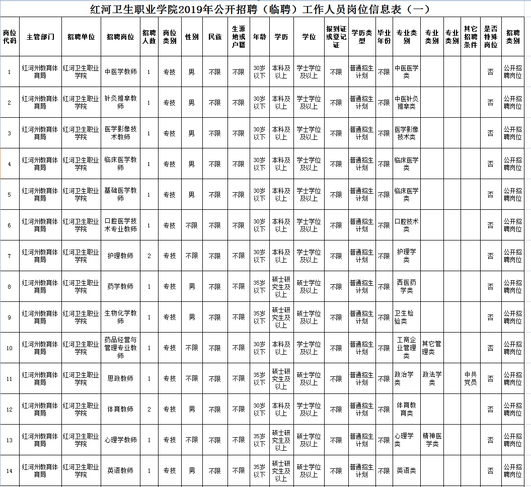 附件1紅河衛(wèi)生職業(yè)學院2019年公開招聘(臨聘)工作人員崗位信息表(一)