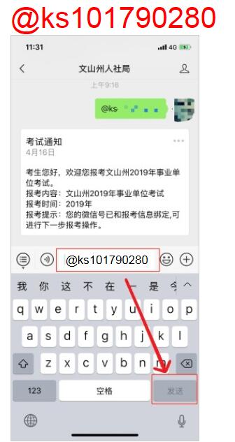 第二步:請(qǐng)將下方@KS和9位數(shù)據(jù)組成的紅色的“驗(yàn)證字符串”(大小寫(xiě)均可,每位考生驗(yàn)證字符串均不同),發(fā)送到文山州人社局微信公眾號(hào),發(fā)送方法見(jiàn)下圖所示.