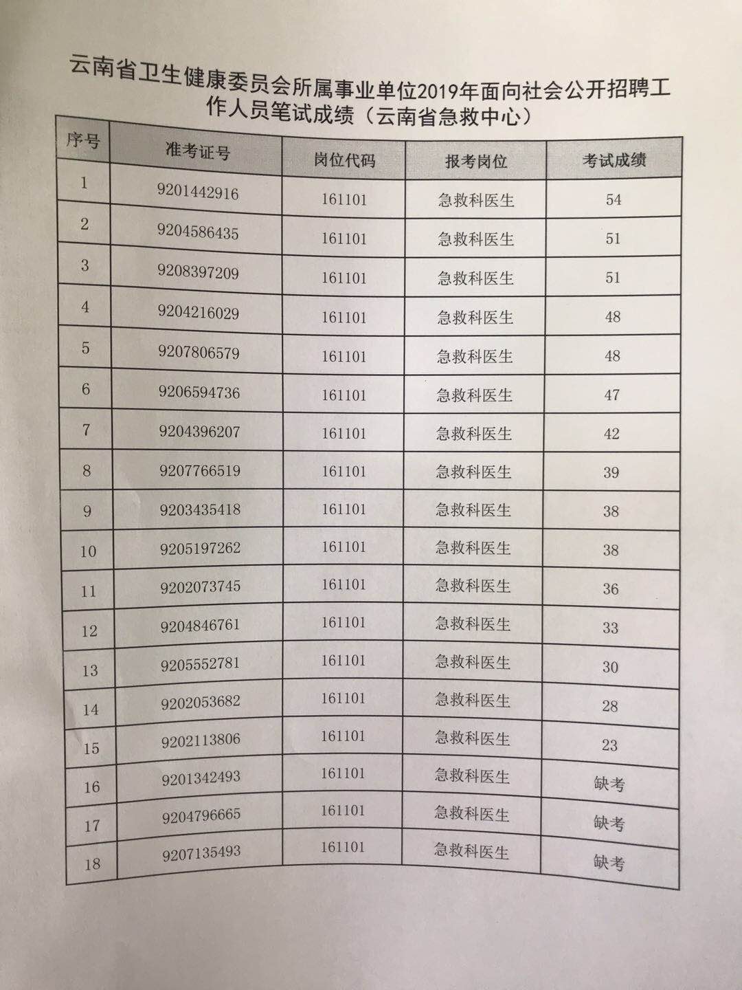 云南省衛(wèi)生健康委員會所屬事業(yè)單位 2019年面向社會公開招聘工作人員筆試成績(云南省急救中心)