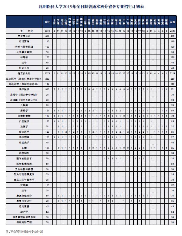 昆明醫(yī)科大學(xué)2019年全日制普通本科分省各專(zhuān)業(yè)招生計(jì)劃表