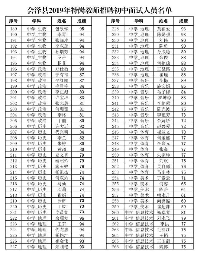 會澤縣2019年特崗教師招聘面試人員名單公告