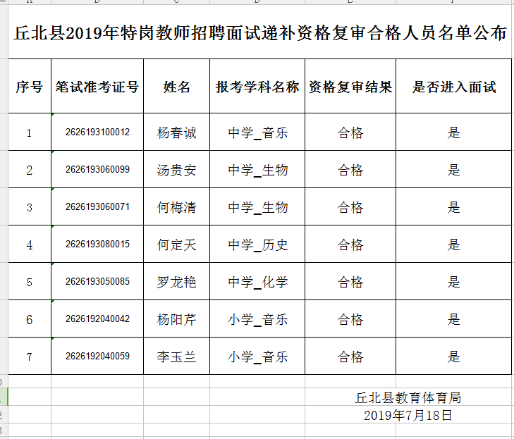 丘北縣2019年特崗教師招聘面試遞補(bǔ)資格復(fù)審合格人員名單公布